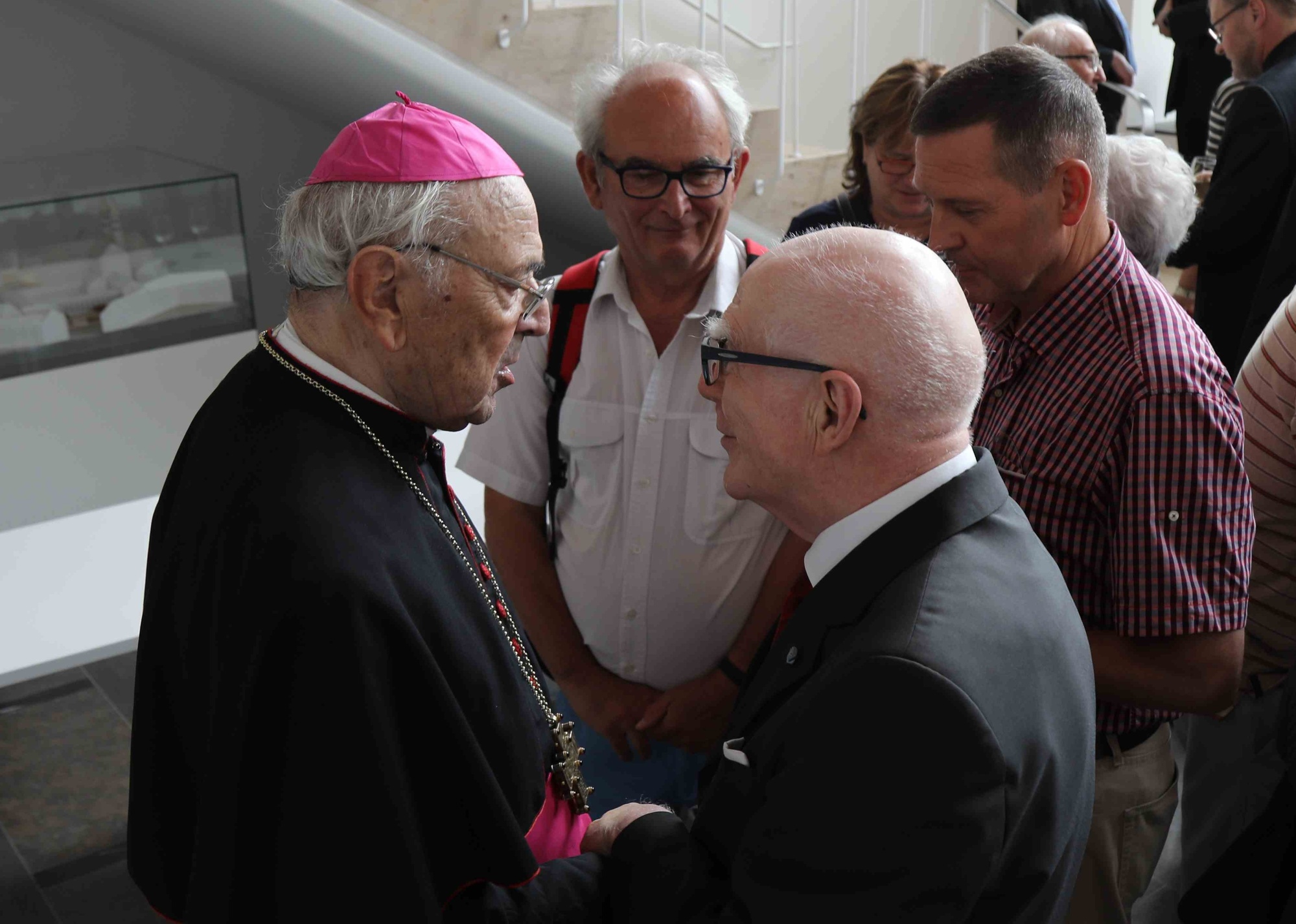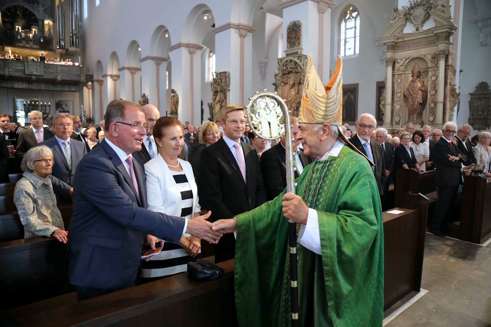 Würzburg (POW) Mit einem Pontifikalgottesdienst im Kiliansdom hat Weihbischof em. Helmut Bauer am Sonntag, 23. Juli, das 60. Jubiläum seiner Priesterweihe begangen. Den Gottesdienst feierte neben Weihbischof Ulrich Boom, Bischof em. Dr. Paul-Werner Scheele sowie Bischof em. Dr. Anton Schlembach (Speyer) und dem Würzburger Domkapitel unter anderem auch der Münsterschwarzacher Altabt Dr. Fidelis Ruppert mit. Unter den vielen Vertretern aus Kirche, Politik und Gesellschaft waren beispielsweise die Landtagsabgeordneten Manfred Ländner und Oliver Jörg sowie die Landräte Thomas Habermann (Rhön-Grabfeld) und Eberhard Nuß (Würzburg), die evangelisch-lutherische Dekanin Dr. Edda Weise, Bezirkstagspräsident Erwin Dotzel und Regierungspräsident Dr. Paul Beinhofer. Insgesamt nahmen rund 1000 Gläubige an der Feier im Kiliansdom teil. Groß war auch die Zahl der Gratulanten beim anschließenden Empfang im Burkardushaus.