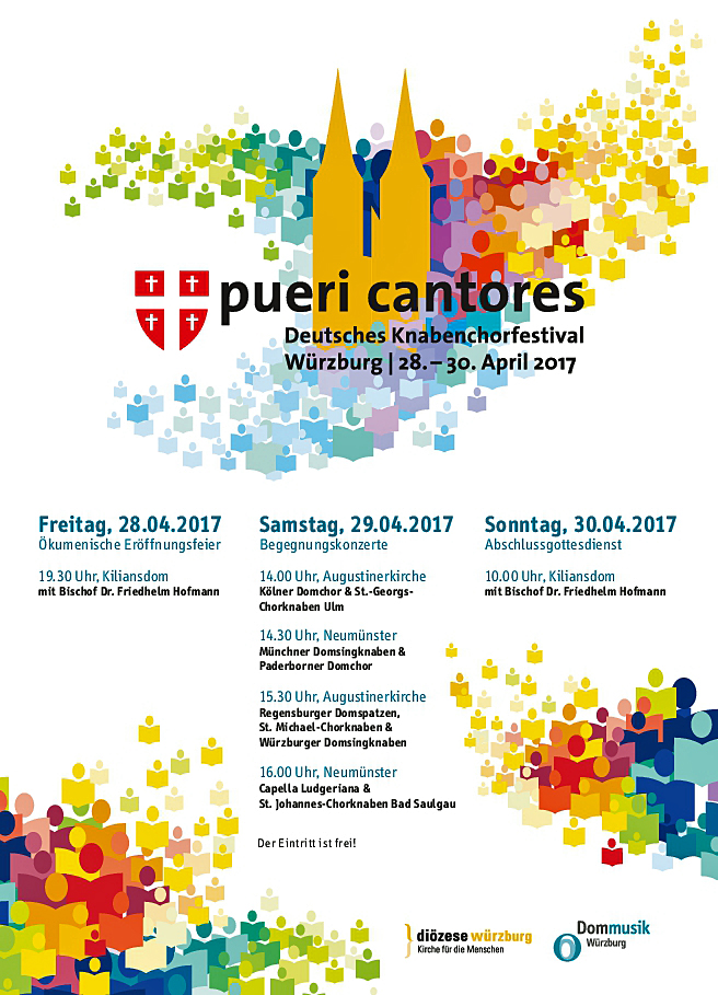 Das Programm des Festivals ist straff getaktet. Als Auftakt feiert Bischof Dr. Friedhelm Hofmann am Freitag, 28. April, um 19.30 Uhr einen ökumenischen Gottesdienst im Kiliansdom. Die Chöre live erleben kann man bei den Begegnungskonzerten am Samstag, 29. April: Um 14 Uhr singen der Kölner Domchor und die Sankt-Georgs-Domknaben Ulm (Augustinerkirche), um 14.30 Uhr die Münchner Domsingknaben und der Paderborner Domchor (Neumünster). Um 15.30 Uhr kann man in der Augustinerkirche die Regensburger Domspatzen, die Sankt Michaels-Chorknaben Schwäbisch Gmünd und die Würzburger Domsingknaben hören. Den Abschluss machen um 16 Uhr die Capella Ludgeriana aus Münster und die Sankt Johannes-Chorknaben aus Bad Saulgau (Neumünster). Der Eintritt zu allen Konzerten ist frei. „Alle sind eingeladen, sich Chöre auf einem hohen Niveau anzuhören, die man sonst nicht so oft in Würzburg hören kann“, sagt Ratz. Der Abschlussgottesdienst mit Bischof Hofmann wird am Sonntag, 30. April, um 10 Uhr im Kiliansdom gefeiert.