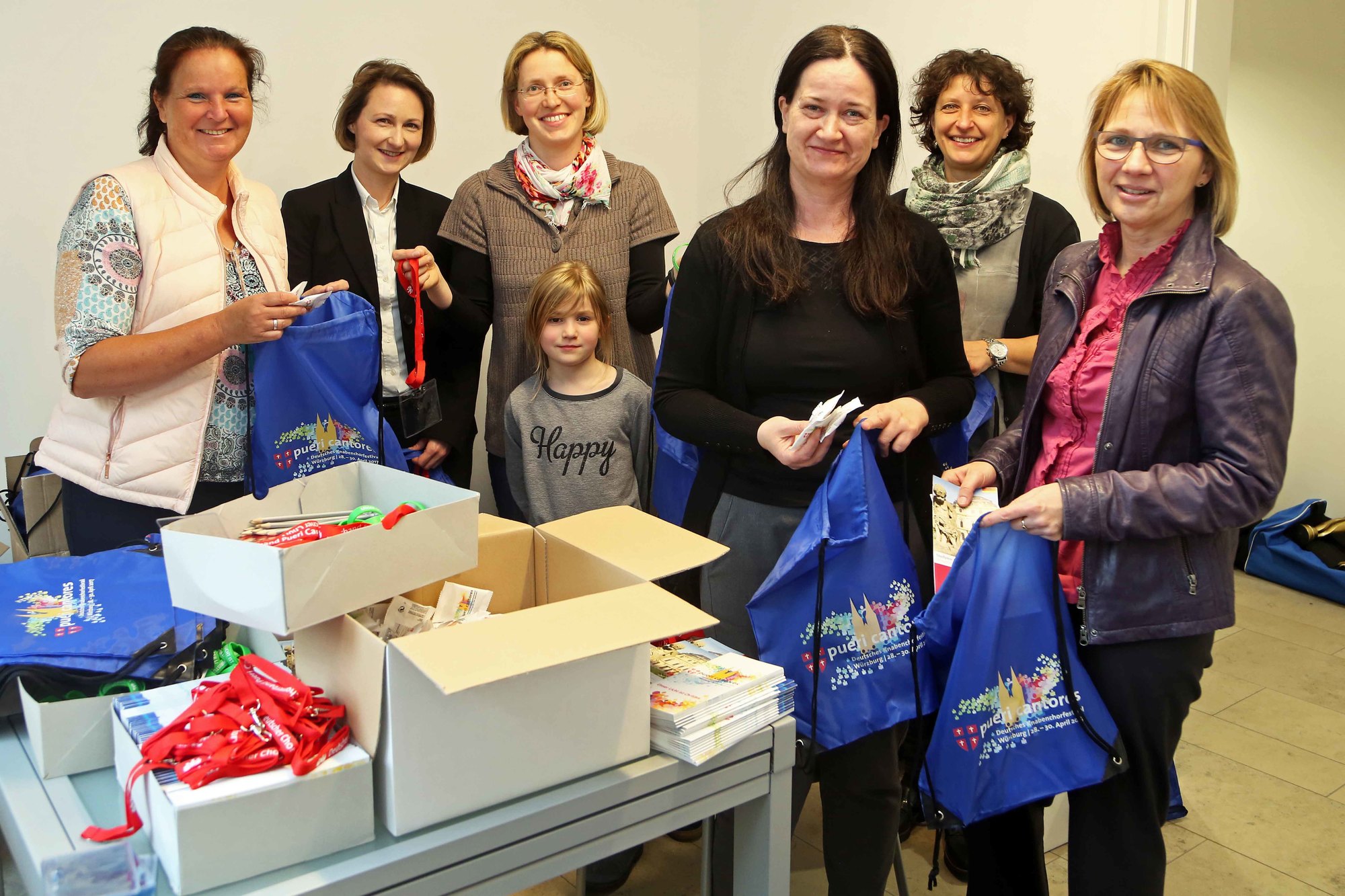 In den Räumen der Dommusik herrscht Hochbetrieb. Ein halbes Dutzend Helferinnen – „wir alle sind Mütter von aktiven Sängern“ – packt Begrüßungsbeutel für die Teilnehmer des Knabenchorfestivals. In jeden der insgesamt 550 blauen Beutel mit dem „Pueri Cantores“-Logo kommt ein Programm, ein Namensschild zum Umhängen, ein Festivalarmband, ein Bleistift, ein Stadtplan und Gummibärchen. Mehr als 50 Personen – das komplette Team der Dommusik Würzburg sowie rund 35 freiwillige Helfer aus den Familien der Domsingknaben, der Mädchenkantorei und des Domchors – sind hinter den Kulissen im Einsatz. Im Sommer 2016 sei die Anfrage vom Deutschen Chorverband Pueri Cantores gekommen, im Herbst hätten die Vorbereitungen begonnen. „Wir mussten schauen, wo 500 Menschen übernachten können, wie sie verpflegt werden, welches Programm wir anbieten, wie wir das Wochenende organisieren“, zählt Ratz auf. Neben Programmen, Flyern und Plakaten wurde auch ein Chorbuch erstellt mit allen Liedern, die während der Gottesdienste von den Chören gesungen werden. Gepackt werden müssen auch die Lunchpakete für die Teilnehmer, die am Freitagabend und vor der Abfahrt am Sonntag verteilt werden.