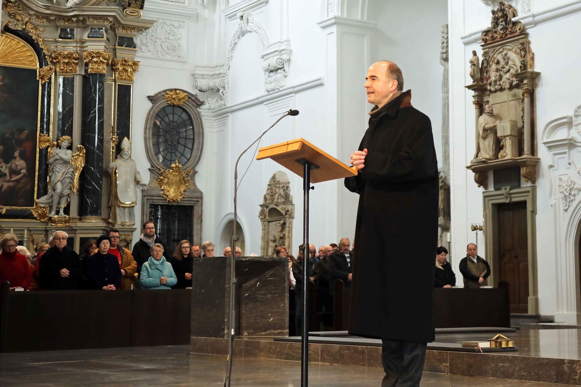 Würzburg (POW) „Es freut mich und ehrt mich sehr, dass Sie so zahlreich im Dom zusammengekommen sind – an meinem ersten Tag, an dem ich mein neues Bistum besuche.“ Das sagte der ernannte Würzburger Bischof Dr. Franz Jung am Freitag, 9. März, beim Mittagsgebet im Kiliansdom zu den rund 1000 Gläubigen. Gemeinsam mit Diözesanadministrator Weihbischof Ulrich Boom und den Mitgliedern des Würzburger Domkapitels betete er das Angelus-Gebet. „Ich freue mich ganz besonders, dass heute unser ernannter Bischof Dr. Franz Jung bei uns ist“, begrüßte Weihbischof Boom die Gläubigen im Kiliansdom. Jung war zu einem „ersten Arbeitsbesuch“ nach Würzburg gekommen. Dabei besichtigte er unter anderem das Bischofshaus und besuchte gemeinsam mit Weihbischof Boom das Kiliansgrab im Neumünster. Im Anschluss an das Mittagsgebet stellte sich Jung vor dem Burkardushaus den Fragen der zahlreichen Medienvertreter.