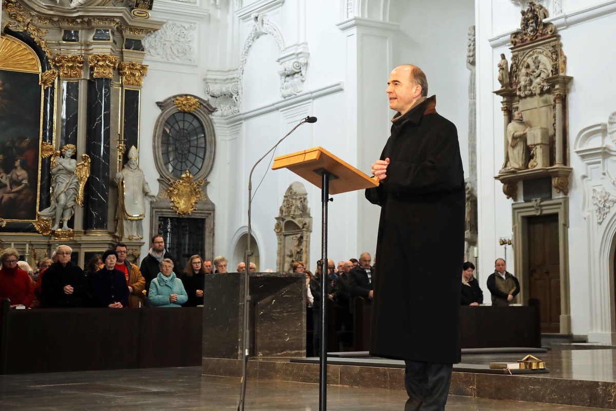 Die Freitage in der Fastenzeit seien alle eine Vorschau auf den „großen Freitag, den Karfreitag“, sagte Jung nach dem Angelus-Gebet. Es berühre ihn immer sehr, wenn im „Gegrüßet seist Du Maria“ gebetet werde: „Bitte für uns Sünder, jetzt und in der Stunde unseres Todes.“ Das Alte loszulassen und mit Christus neu zu gehen, das seien die Herausforderung und die Gnade, unter der diese heiligen 40 Tage auf Ostern hin stünden. „Für mich persönlich als der ernannte Bischof ist es die Vorbereitung auf die neue Aufgabe, Altes hinter sich zu lassen und ganz den neuen Weg zu gehen. Für jeden Einzelnen von uns stellt sich die Frage, wo muss ich mit diesem Christus sterben, wo müssen wir als Pfarrei, als Gemeinde, als Bistum neu aufbrechen?“ Dazu brauche es die Fürsprache der Gottesmutter Maria, sagte Jung und betonte: „Ich freue mich, mit Ihnen gemeinsam den Weg ab dem 10. Juni und in den kommenden Jahren gehen zu dürfen. Ich lade Sie alle herzlich ein, sich mit mir gemeinsam auf diesen Weg zu machen.“