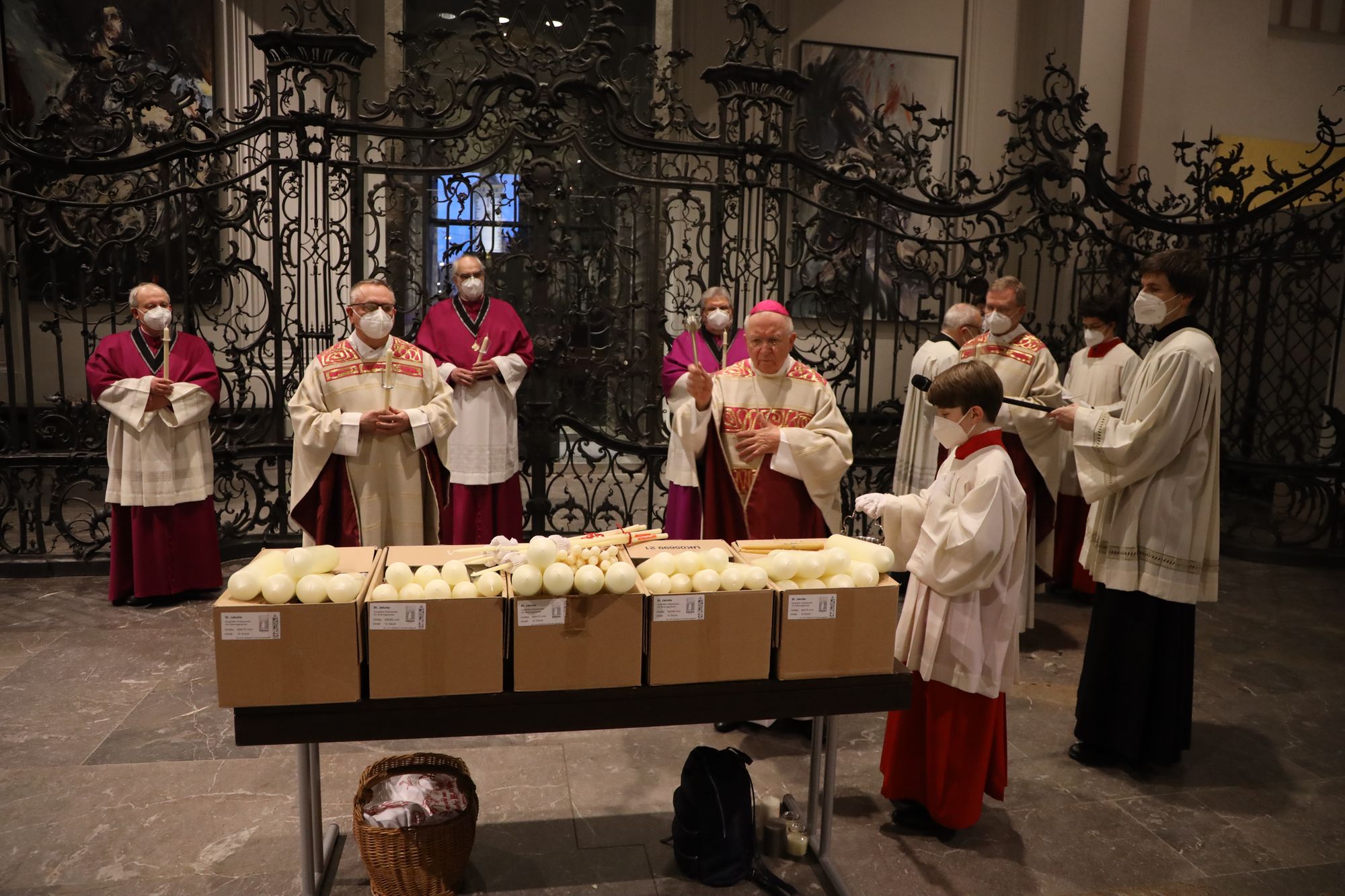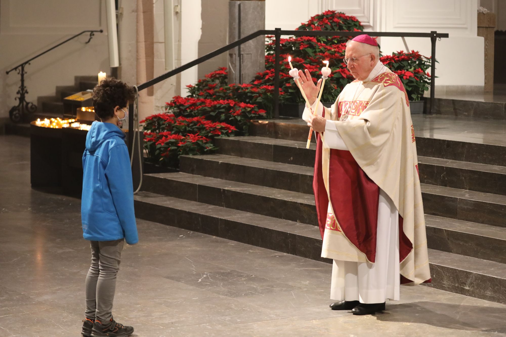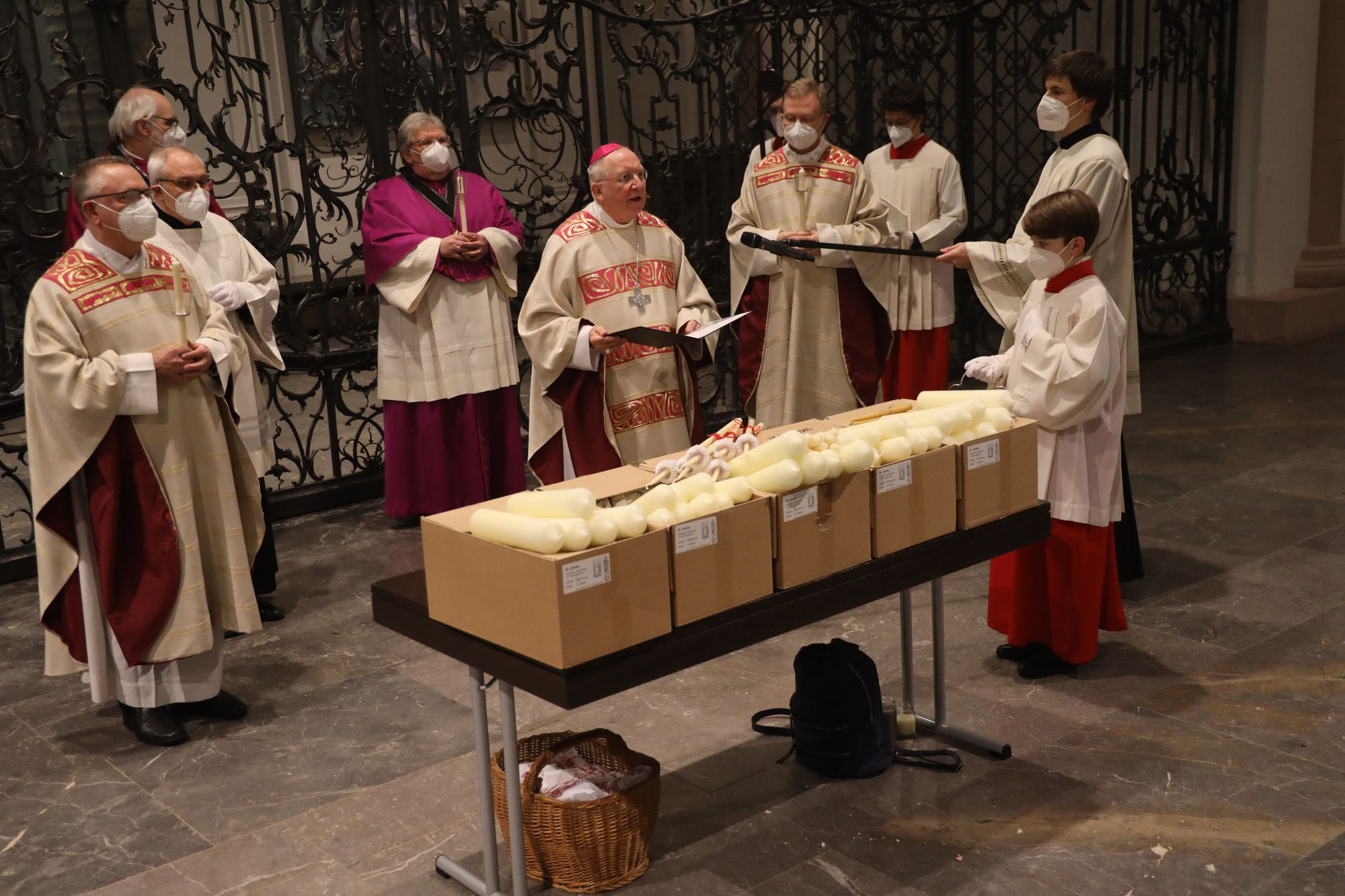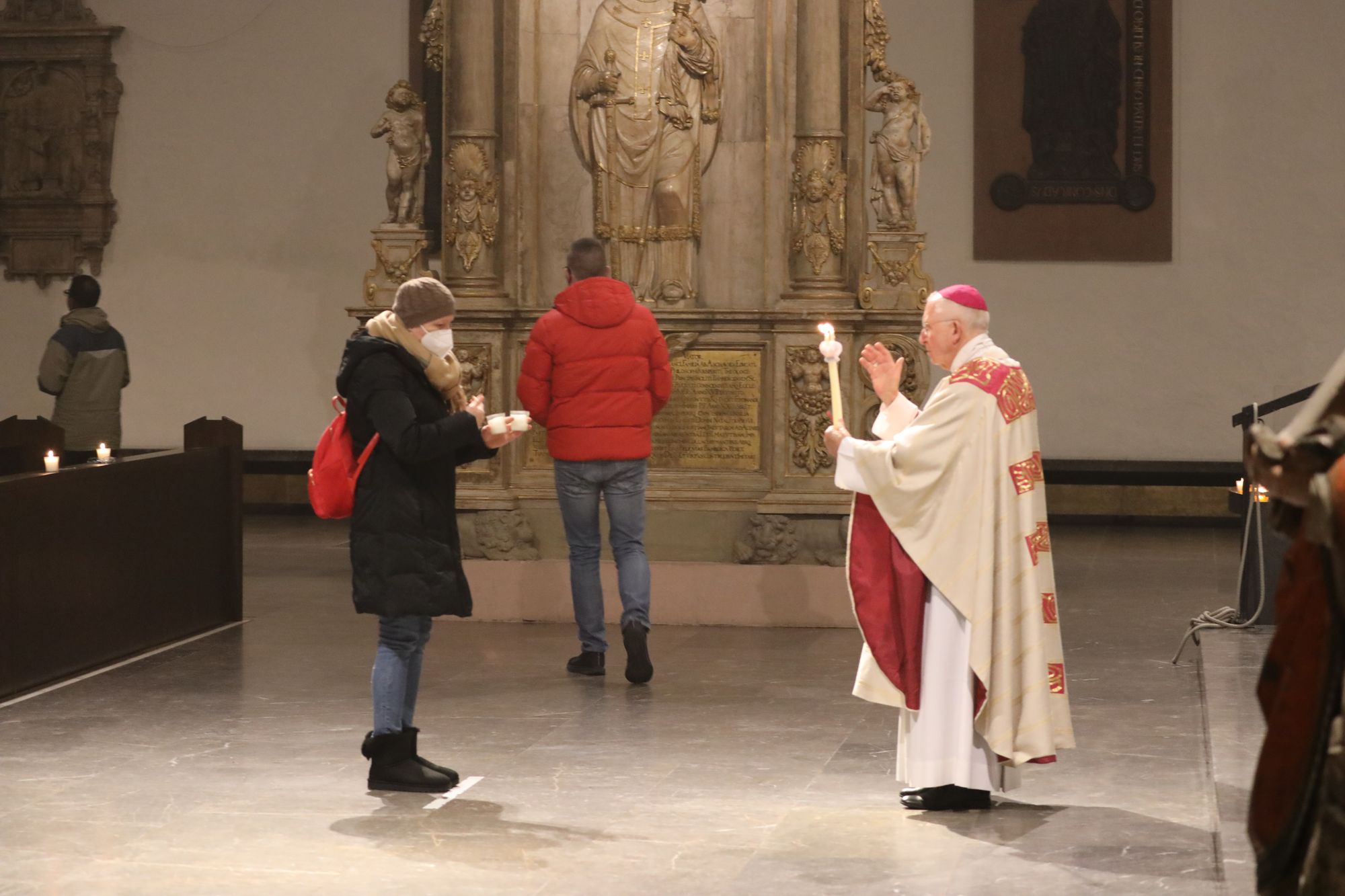Würzburg (POW) „Wir dürfen vertrauen, dass Gott uns immer wieder einen neuen Morgen und am Ende einen ewigen neuen Tag schenkt.“ Das hat Weihbischof Ulrich Boom beim Pontifikalamt am Fest der Darstellung des Herrn am Montagabend, 2. Februar, im Würzburger Dom betont. Das Fest ist im Volksmund als „Mariä Lichtmess“ bekannt. Am Ende des Gottesdiensts unter Coronabedingungen spendete der Weihbischof zunächst vom Altar aus den allgemeinen Blasiussegen, ehe er und weitere Priester den Gläubigen den persönlichen Blasiussegen erteilten, in diesem Jahr still und mit Abstand.