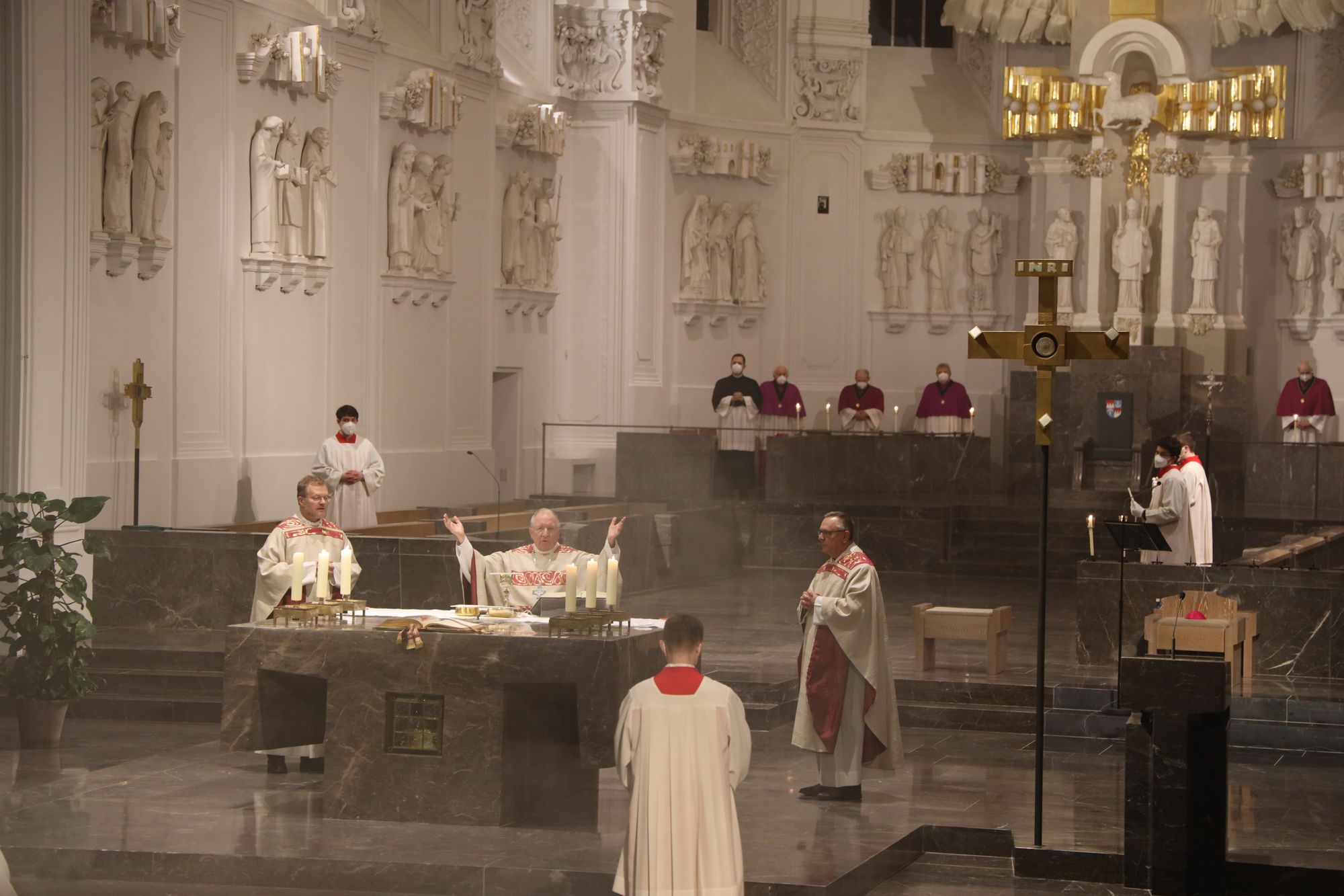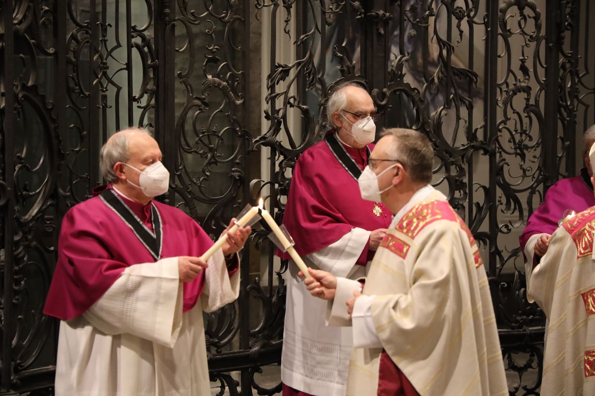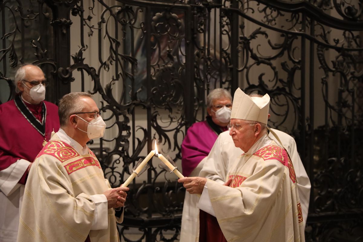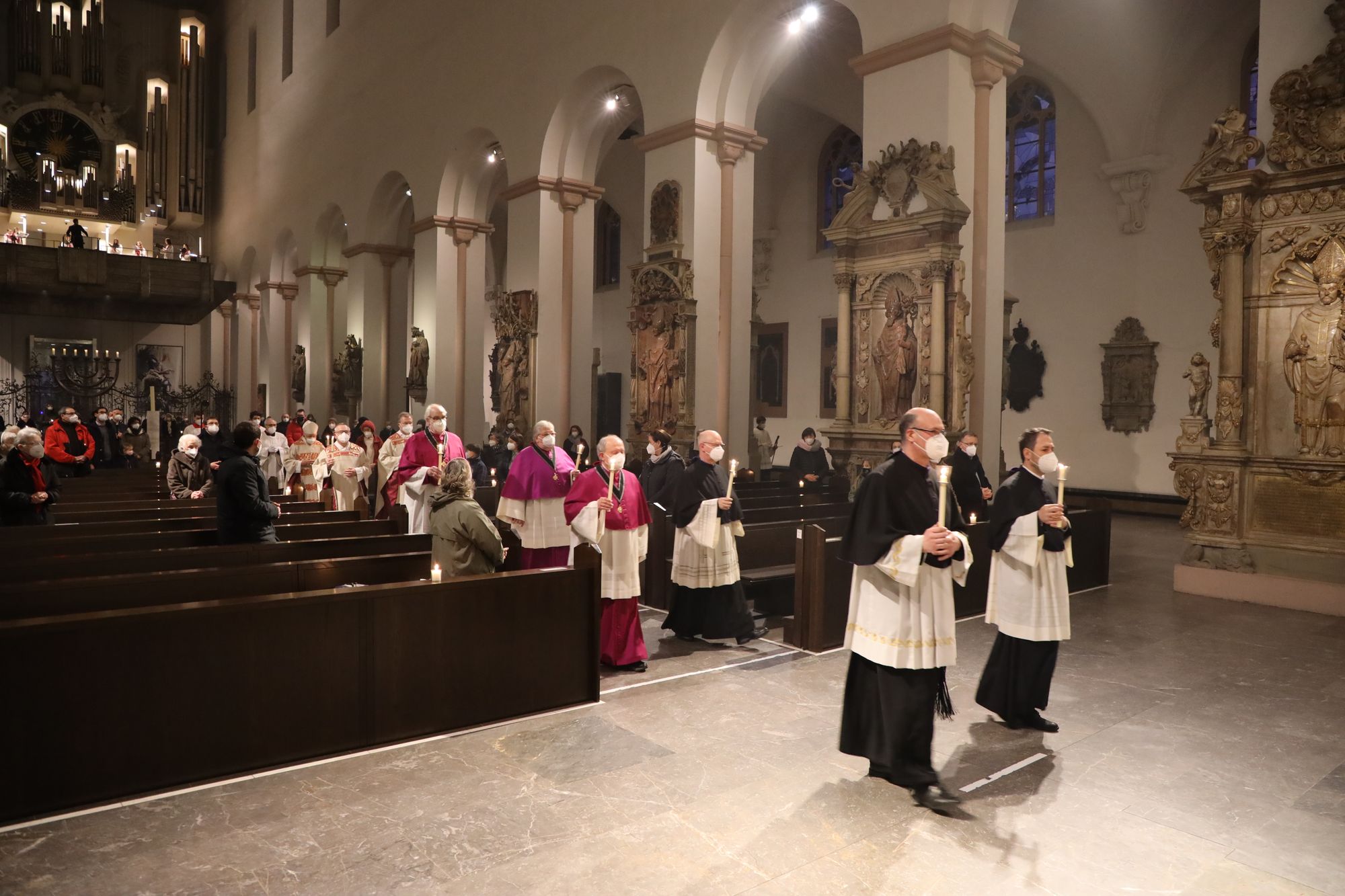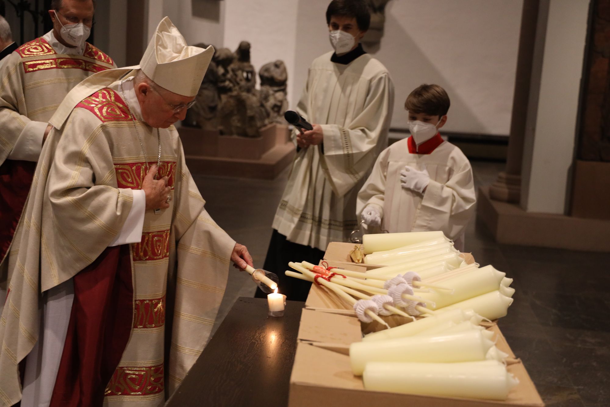 Würzburg (POW) „Wir dürfen vertrauen, dass Gott uns immer wieder einen neuen Morgen und am Ende einen ewigen neuen Tag schenkt.“ Das hat Weihbischof Ulrich Boom beim Pontifikalamt am Fest der Darstellung des Herrn am Montagabend, 2. Februar, im Würzburger Dom betont. Das Fest ist im Volksmund als „Mariä Lichtmess“ bekannt. Am Ende des Gottesdiensts unter Coronabedingungen spendete der Weihbischof zunächst vom Altar aus den allgemeinen Blasiussegen, ehe er und weitere Priester den Gläubigen den persönlichen Blasiussegen erteilten, in diesem Jahr still und mit Abstand.