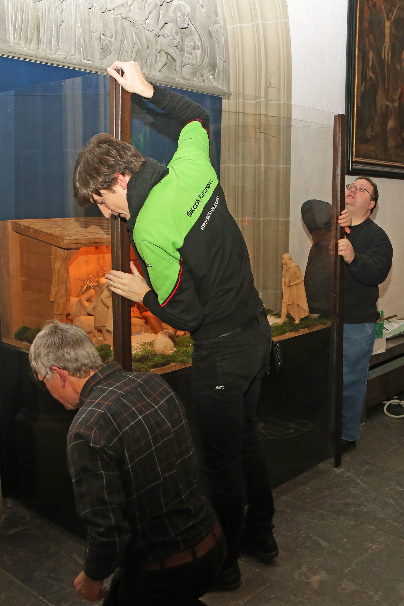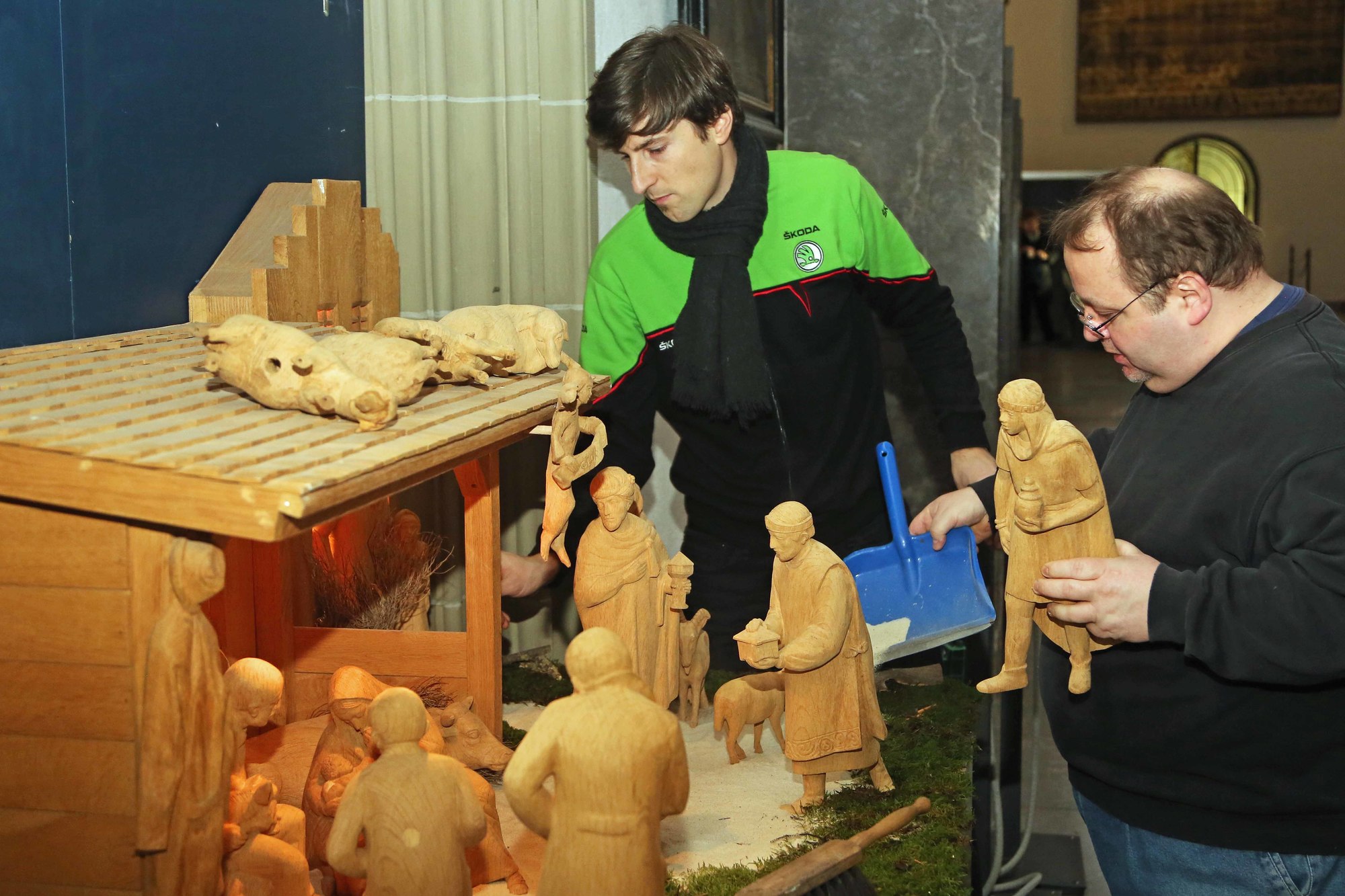 Insgesamt fünf Weihnachtsbäume haben die Mesner aufgestellt – zwei im Dom, zwei im Neumünster und einen kleinen in der Anbetungskapelle des Neumünsters. Sie müssen noch geschmückt werden, mit Strohsternen und Lichterketten. „Die Lichter bleiben noch aus, aber es ist alles schon vorbereitet.“ Auch die große Krippe im Kiliansdom wird jetzt fertig aufgebaut. „Wir haben schon vor zwei Wochen angefangen, die Krippen und den Unterbau vorzubereiten“, erzählt Till. Mit einer Schaufel verteilt Schumann feinen Sand zwischen den aus Holz geschnitzten Figuren. Till legt Moos und kleine Reisigbündel aus. Jetzt müssen nur noch vier Schafe platziert werden. „Die müssen fressen“, scherzt Till und stellt ein Schaf vor das frische, noch saftige Moos. Eine Kindergruppe sieht fasziniert zu und macht Fotos mit ihren Smartphones. Auch viele Erwachsene bleiben stehen und stellen Fragen zur Krippe. Jetzt fehlen nur noch die großen Plexiglasscheiben, mit denen die Krippe geschützt wird. Im Laufe der Zeit mussten immer wieder Figuren nachgeschnitzt werden, weil sie kaputt gegangen oder verschwunden waren, erzählt Schumann. Als alles fertig ist, schalten die Mesner die Krippenbeleuchtung aus. Sie wird erst am Heiligen Abend wieder eingeschaltet.
