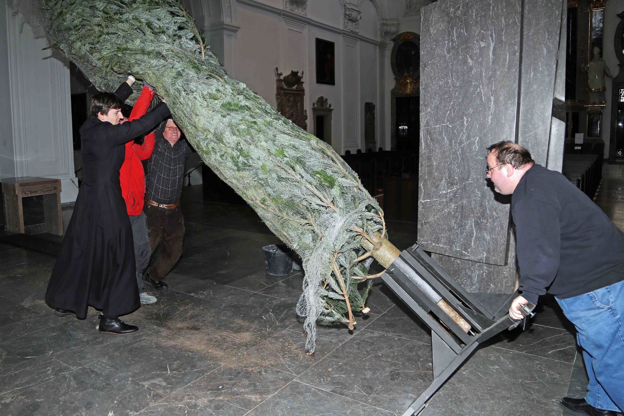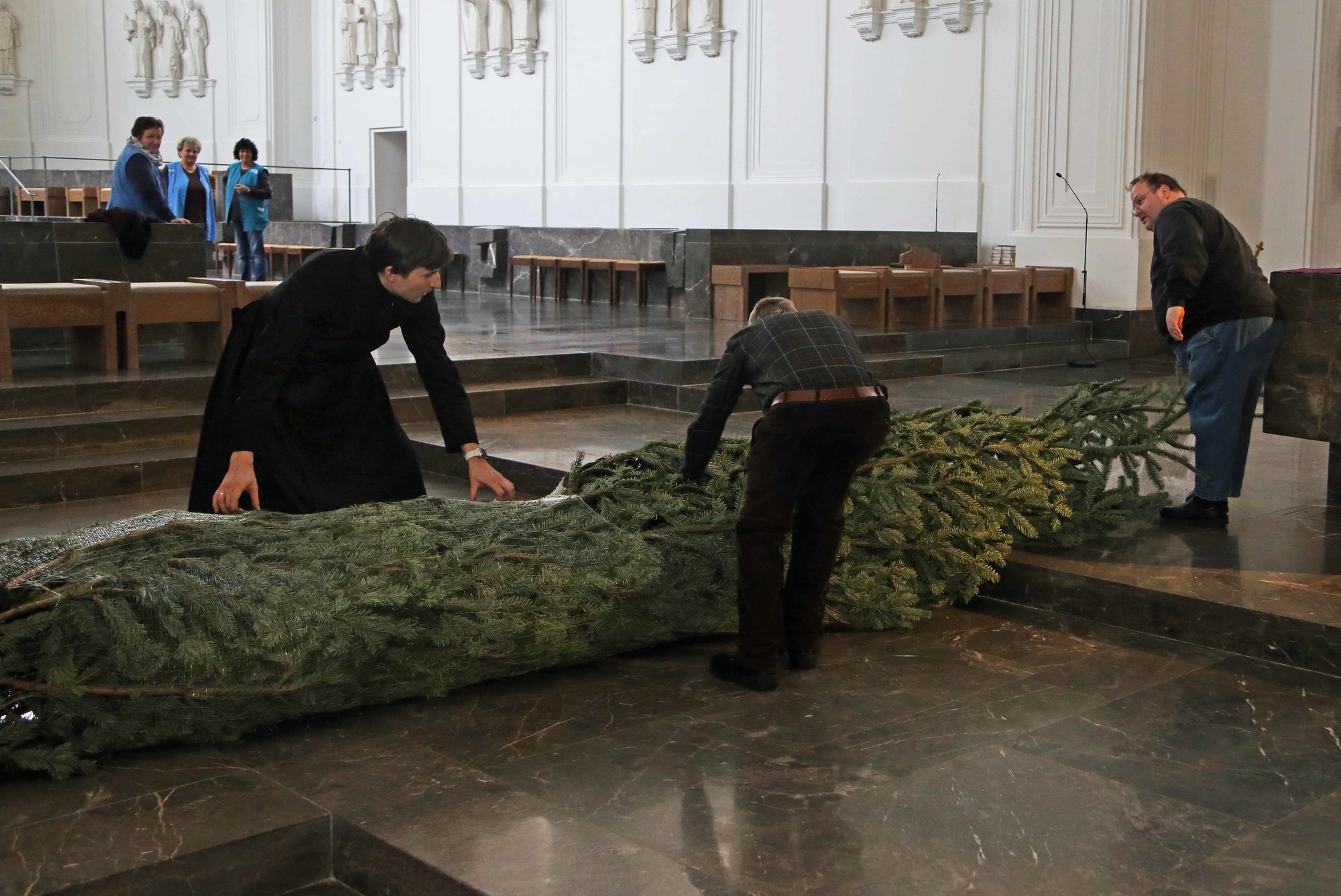 Würzburg (POW) „Ich hab‘ das Gefühl, der steht schon fast gerade.“ Dommesner Thomas Schumann läuft einige Schritte rückwärts und betrachtet mit leicht zusammengekniffenen Augen den Weihnachtsbaum im Würzburger Kiliansdom. Fast sechs Meter misst die Tanne, die Schumann, sein Kollege Roman Till und zwei Helfer soeben mitsamt dem schweren Metallständer aufgestellt haben. „Besser geht’s nicht“, sagt Schumann und nickt zufrieden. Kerzengerade steht der Baum. Die Adventszeit – insbesondere die Woche vor Heiligabend – ist für die Dommesner besonders arbeitsintensiv. „Es ist stressig. Aber es hat immer geklappt!“, sagen beide.