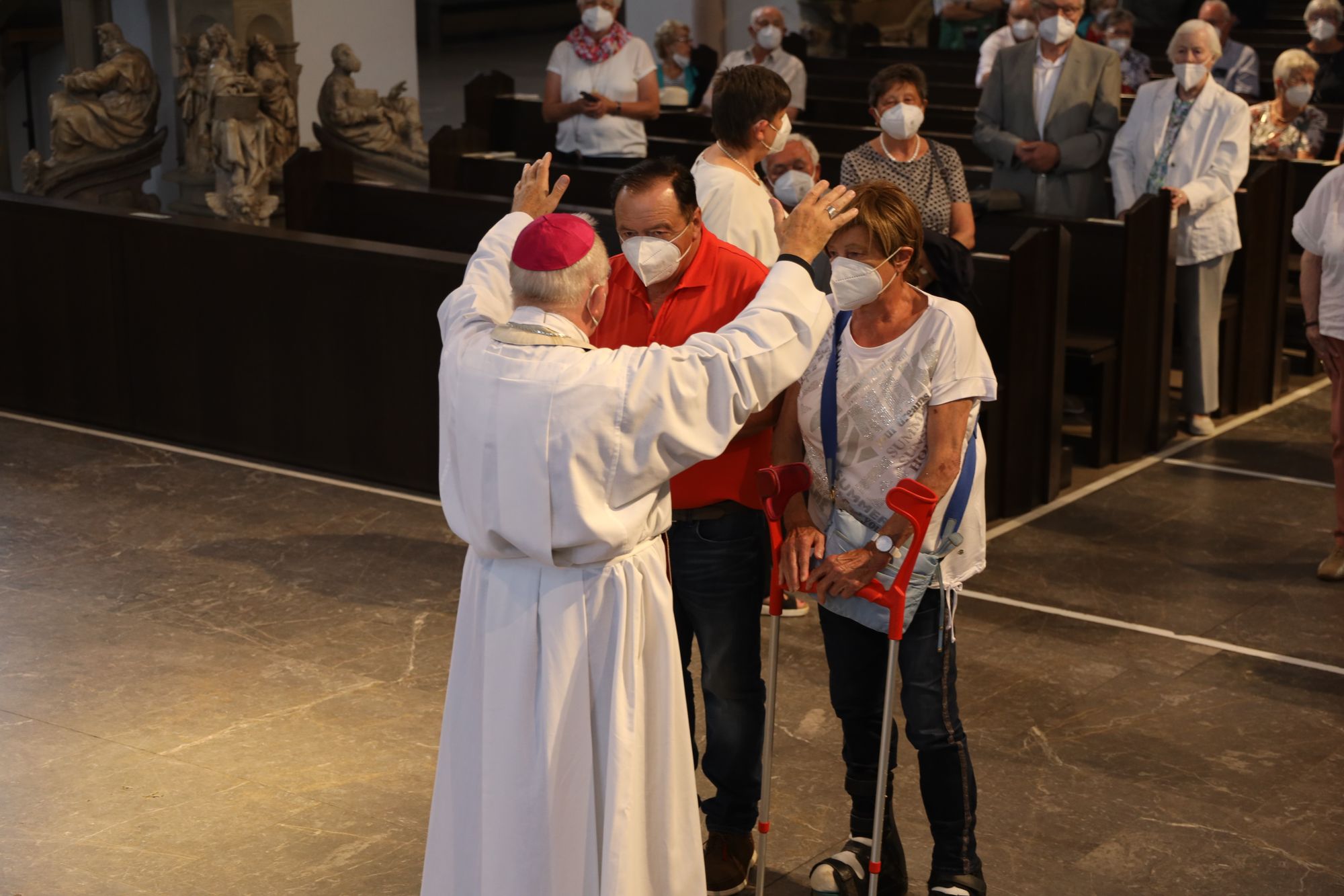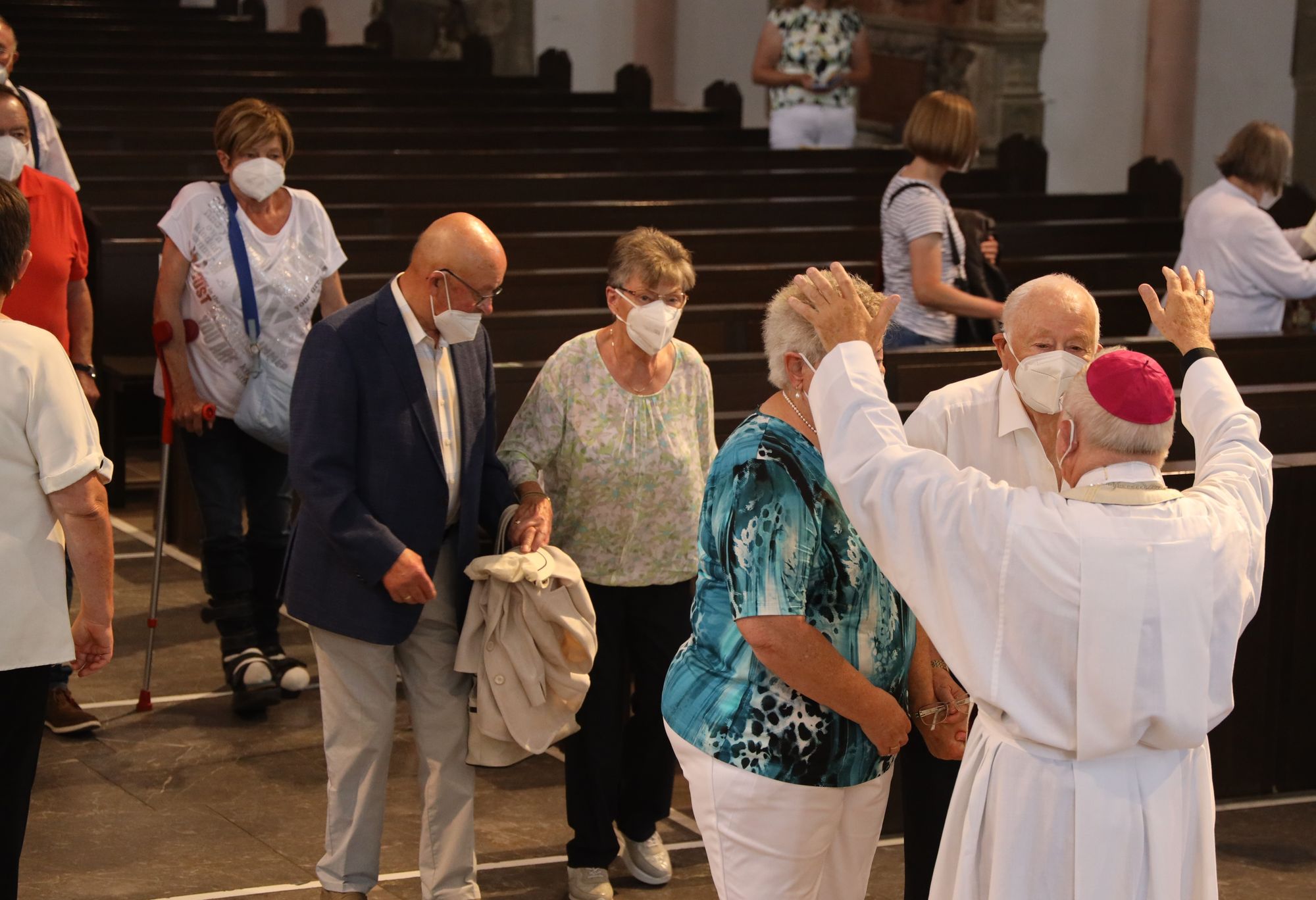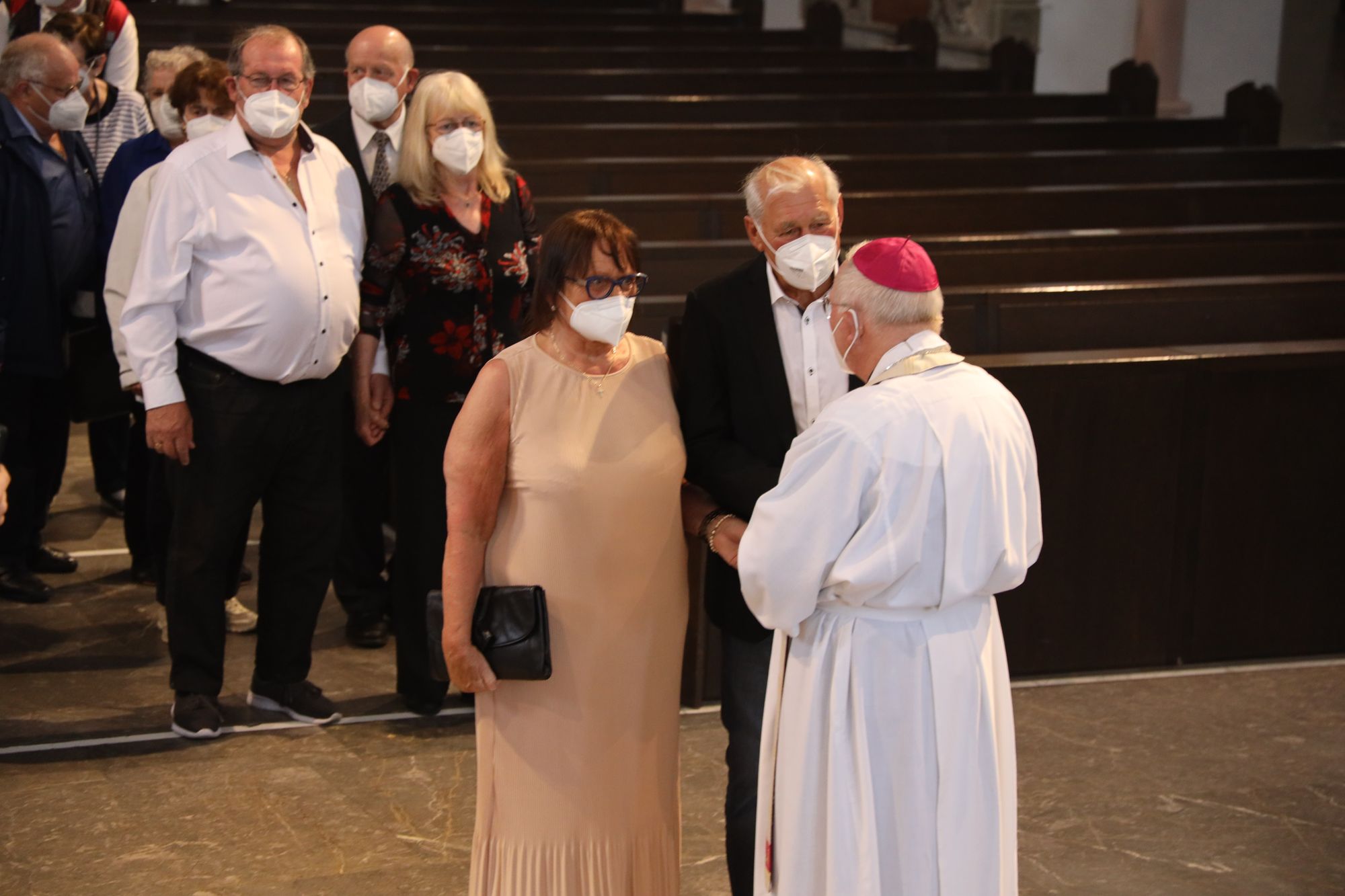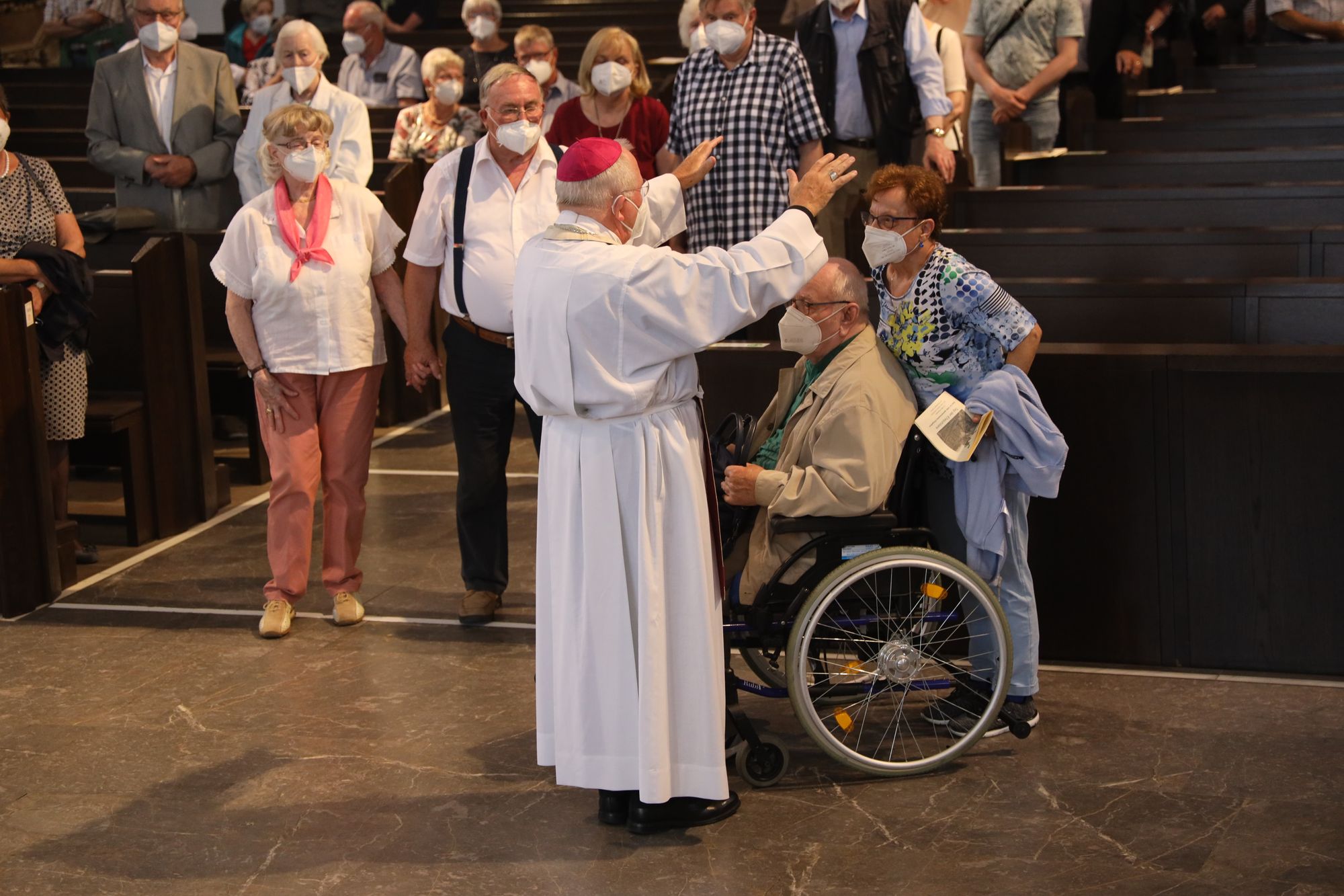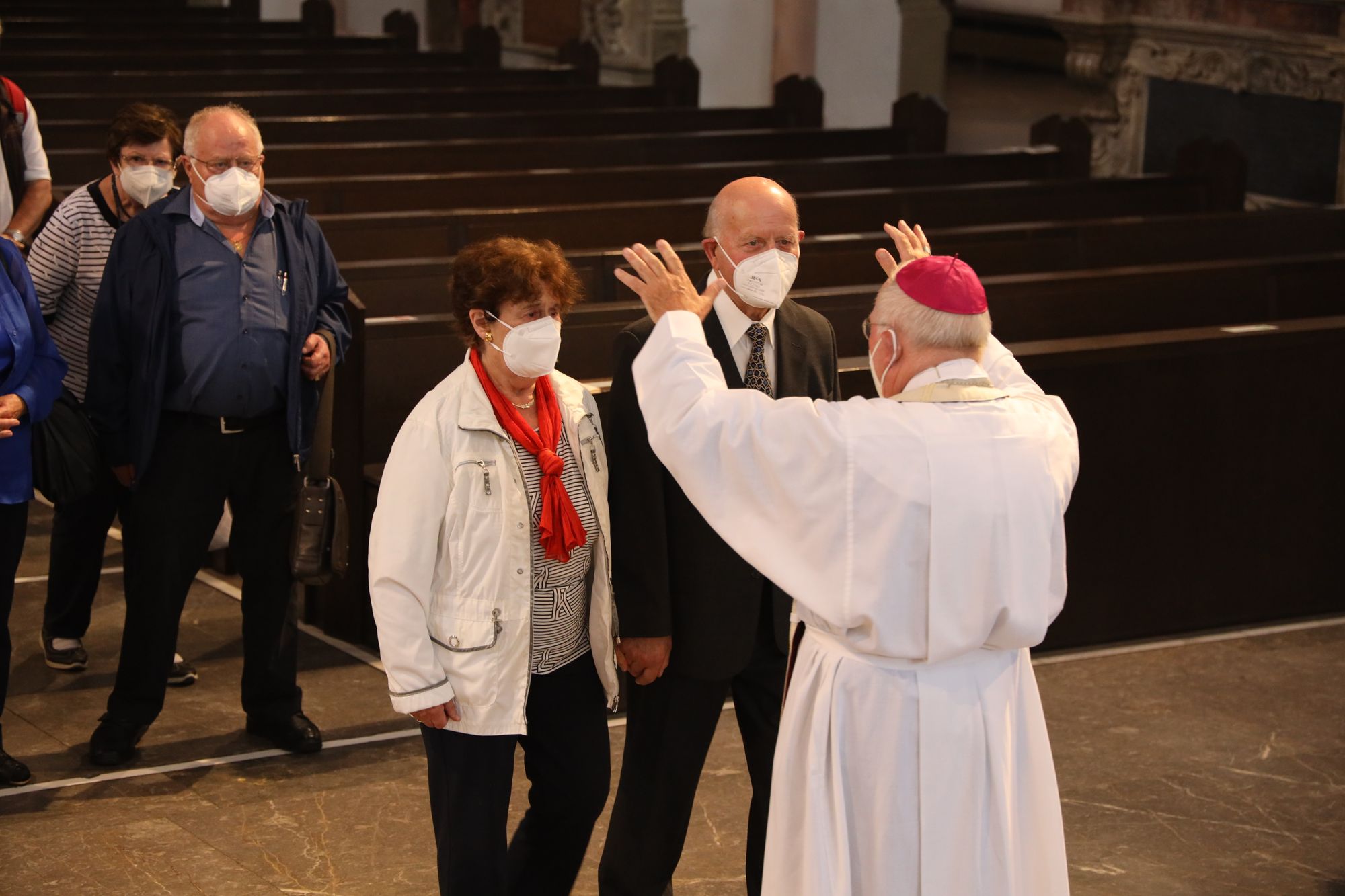 Würzburg (POW) Mit rund 110 Ehepaaren aus der ganzen Diözese hat Weihbischof Ulrich Boom am Mittwochnachmittag, 23. Juni, einen Pontifikalgottesdienst gefeiert. Eingeladen waren Ehejubilare, die in den Jahren 2020 und 2021 auf 50, 60 oder 65 gemeinsame Jahre zurückblicken. „Für das Zeugnis des Vertrauens, das Sie mit Ihren 50, 60, 65 Ehejahren vielen Menschen gegeben haben, möchte ich Ihnen herzlich danken“, sagte Weihbischof Boom zu den Frauen und Männern, die den Gottesdienst im Würzburger Kiliansdom unter den aktuellen Corona-Beschränkungen feierten.