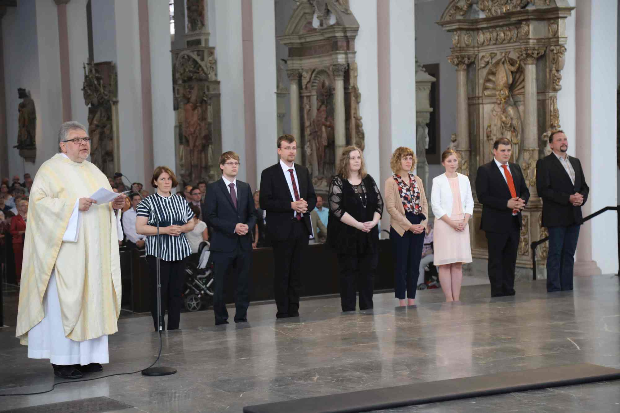 Würzburg (POW) Bei einem feierlichen Gottesdienst im Kiliansdom hat am Freitagabend, 21. Juli, Weihbischof Ulrich Boom vier Frauen und vier Männer zum Dienst als Pastoralreferenten und Gemeindereferentinnen beauftragt. Isabel Oestreicher (25), Katharina Simon (27) und Heike Trapp (49) begrüßte der Weihbischof als Gemeindereferentinnen. Johannes Dürig (33), Andreas Kees (31), Stefanie Krömker (51), Florian Meier (35) und Burkhard Pechtl (46) ernannte er zu Pastoralreferenten. Es konzelebrierten neben Generalvikar Thomas Keßler und Domkapitular Monsignore Dietrich Seidel Geistliche aus den aktuellen und künftigen Einsatzpfarreien der Beauftragten. Rund 60 Ministranten und insgesamt etwa 700 Gläubige aus den jeweiligen Ausbildungs- und Heimatgemeinden der Beauftragten feierten den Gottesdienst mit. Dieser stand unter dem Psalmwort „Der Herr ist mein Licht und mein Heil: Vor wem sollte ich mich fürchten?“.